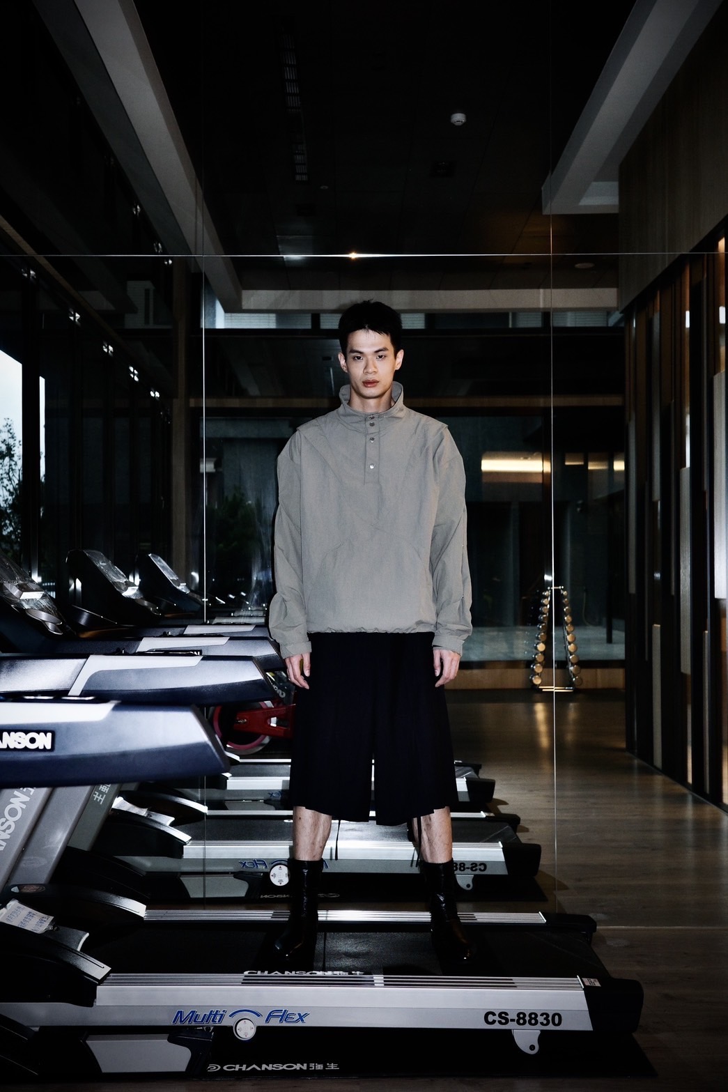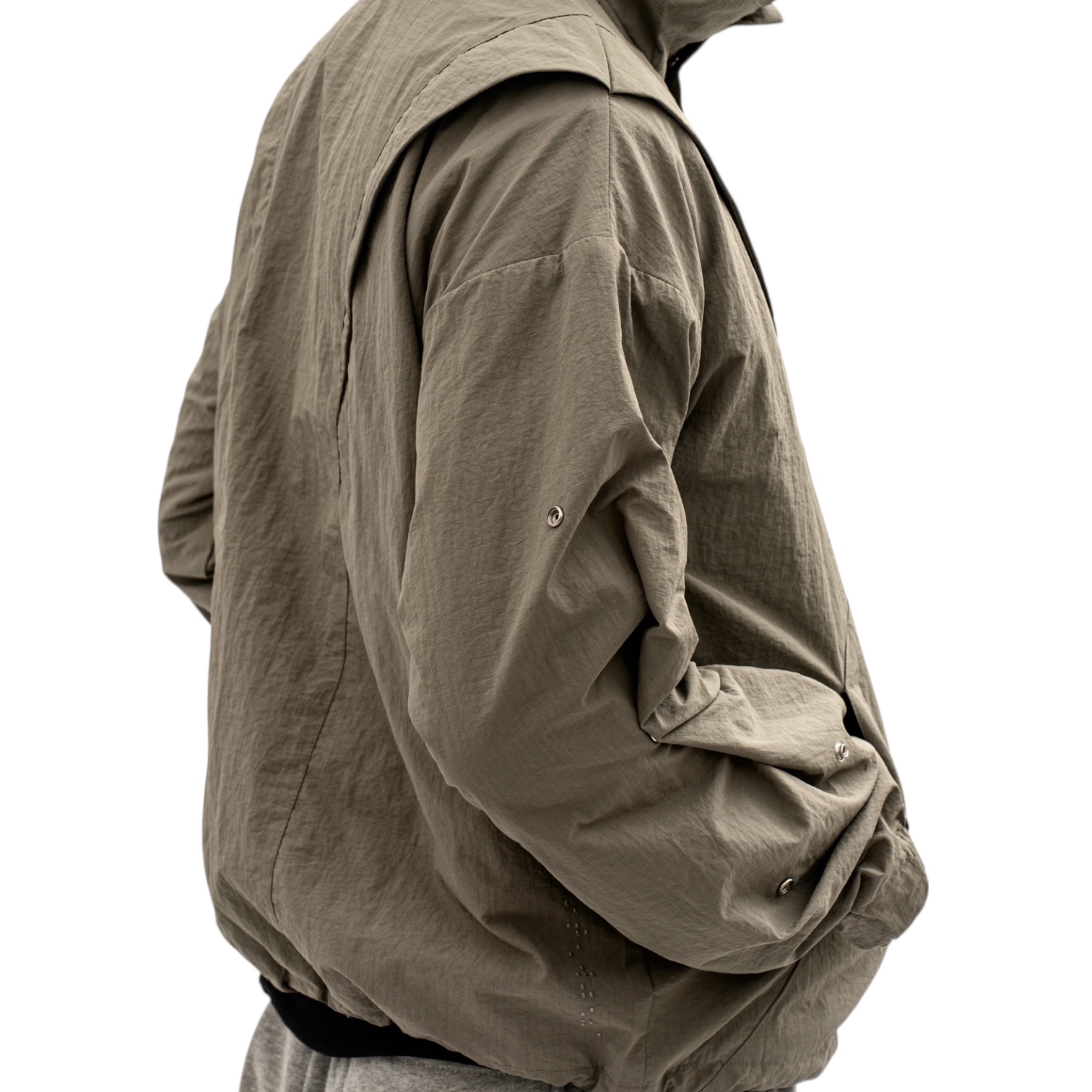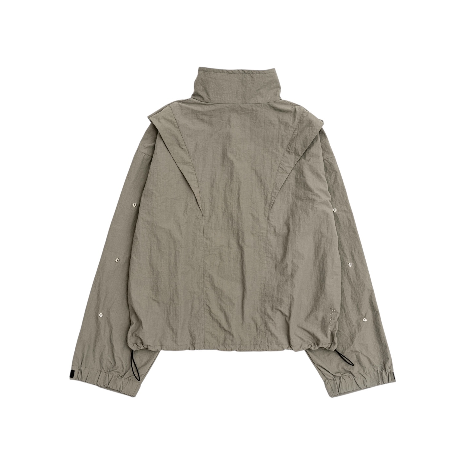 Adjustable collar, hem, and sleeves allow flexible silhouette control, balancing proportion and freedom of movement.