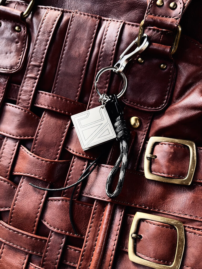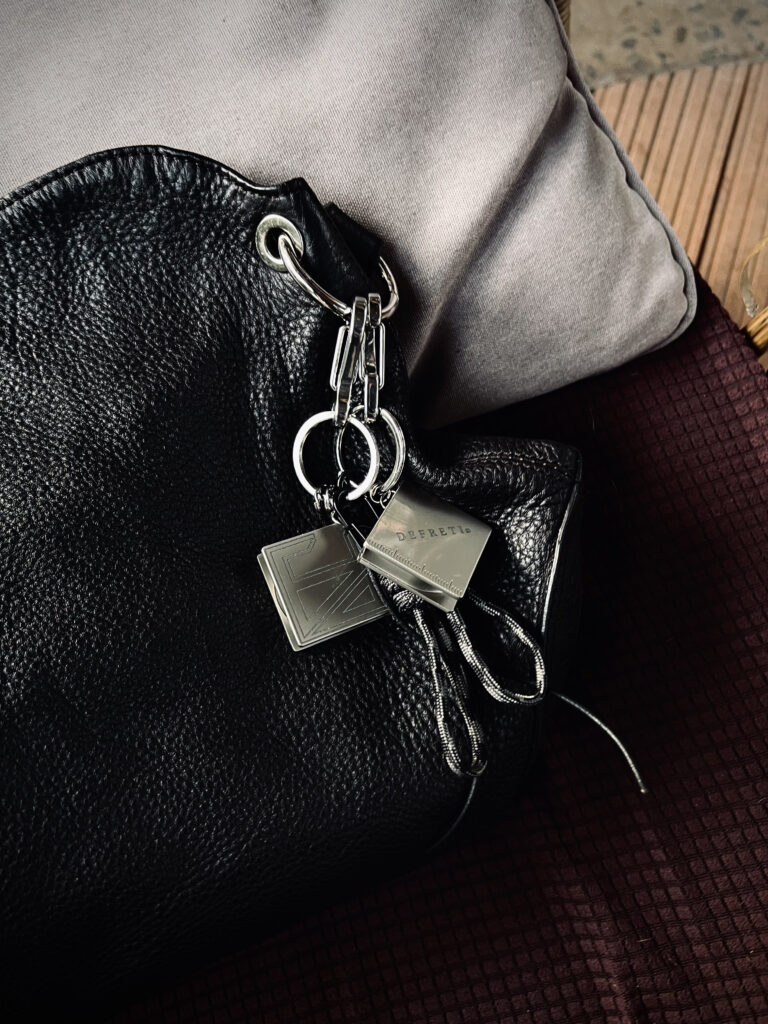 Finished with a leather cord and rope knot,it adds a subtle highlight whether clipped at the waist or on a bag.