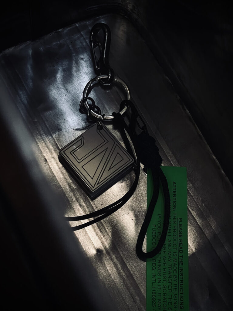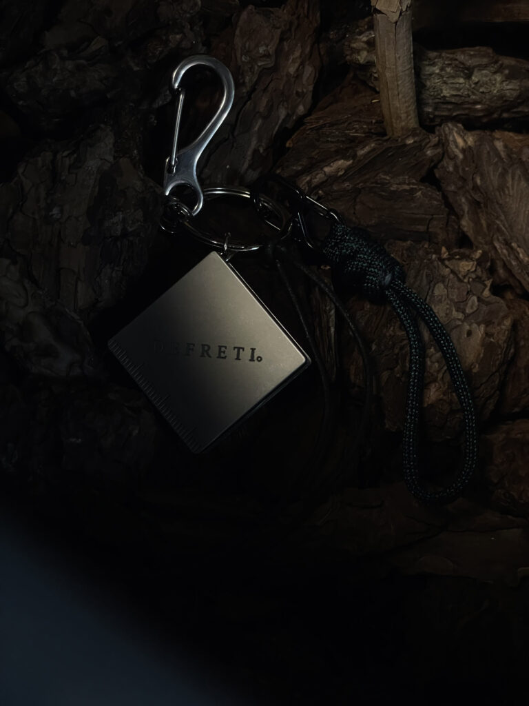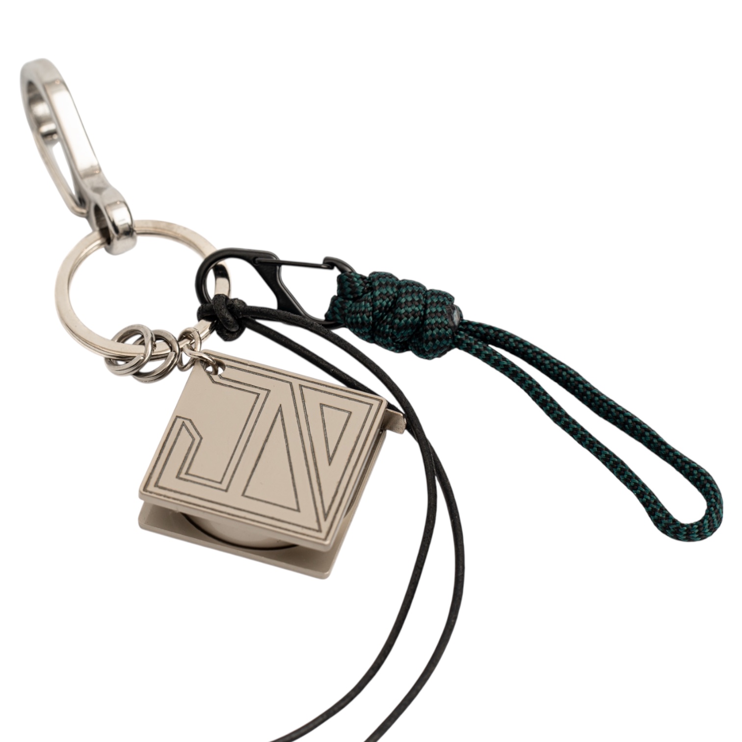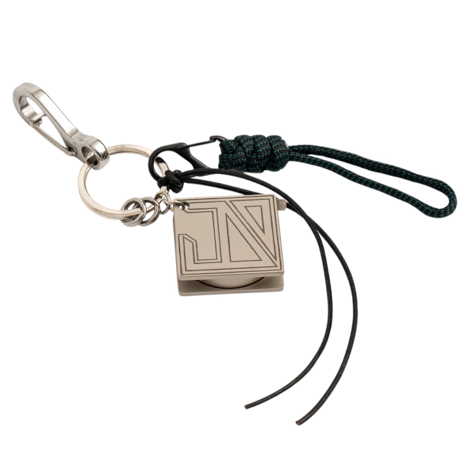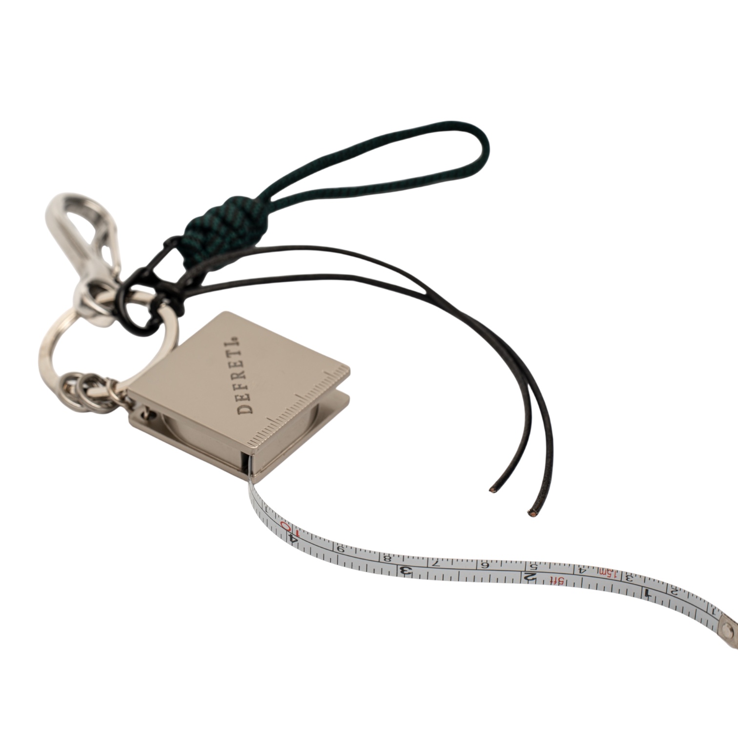 小巧且實用的金屬捲尺,表面雷射雕刻品牌標誌。搭配皮繩與繩結掛件,無論掛在腰間或包包上,都是低調卻吸睛的細節。